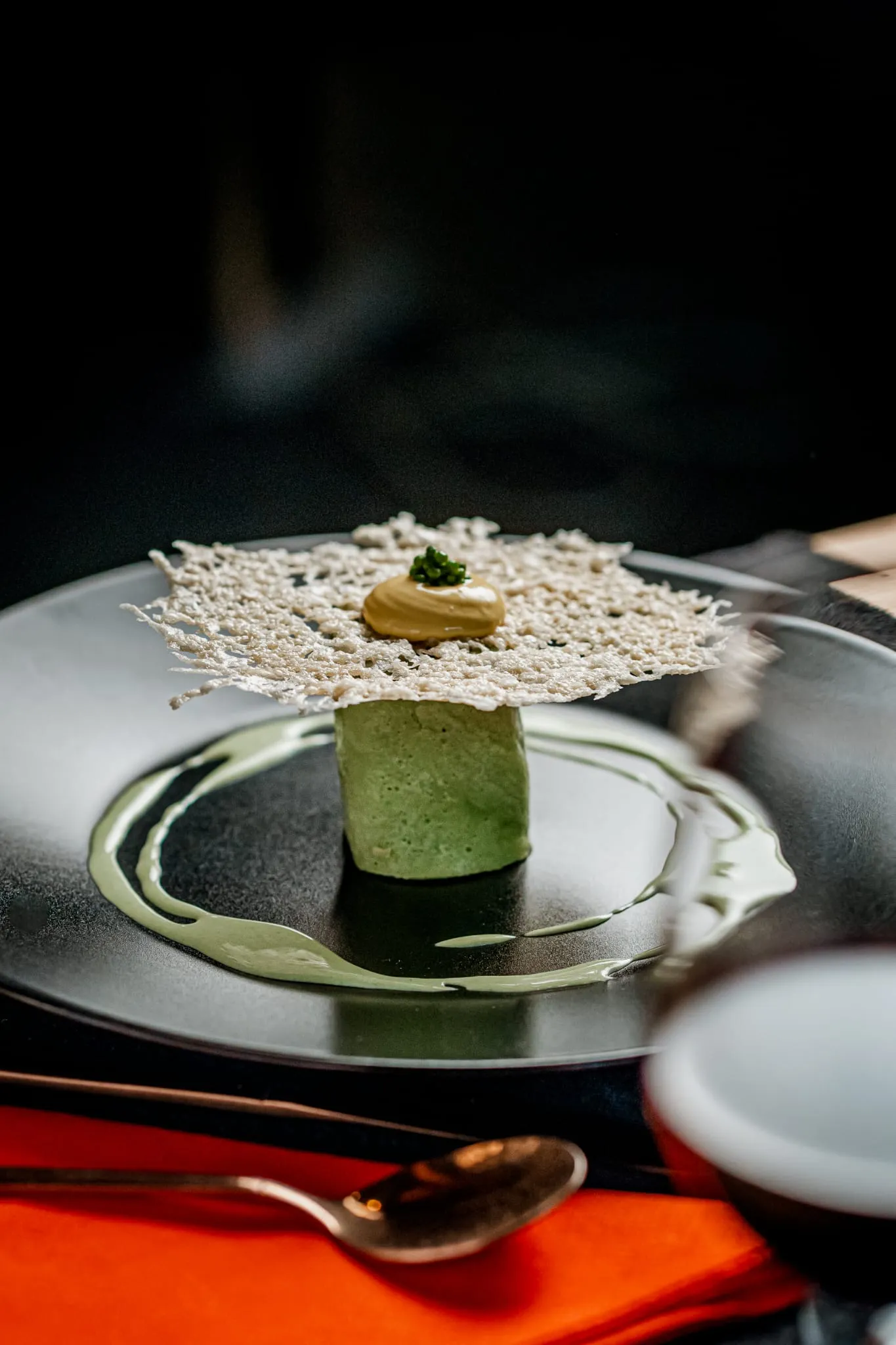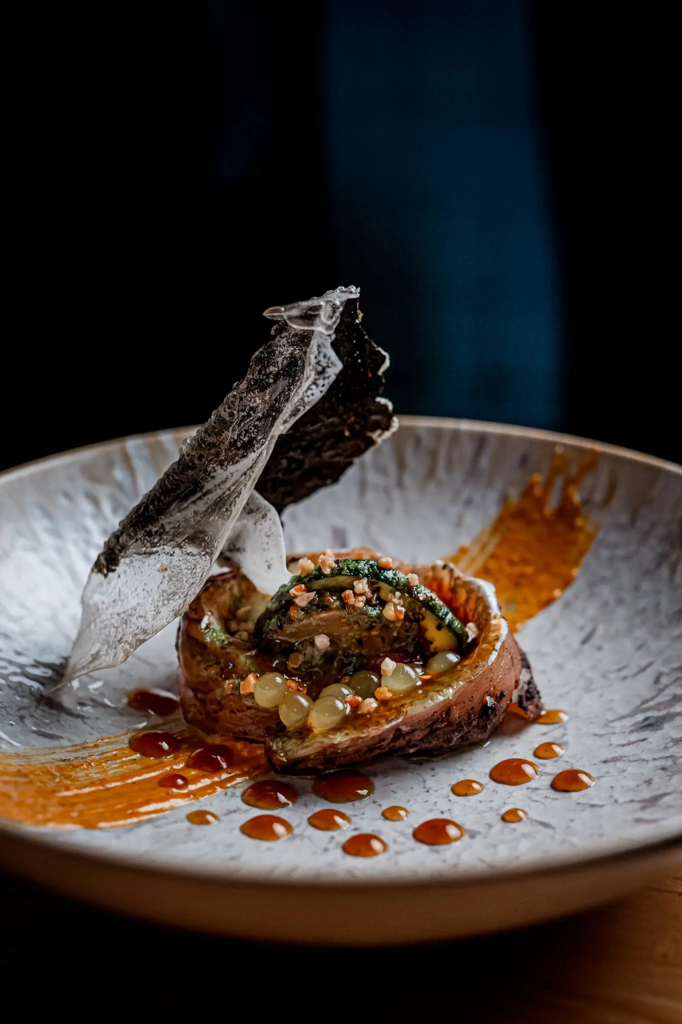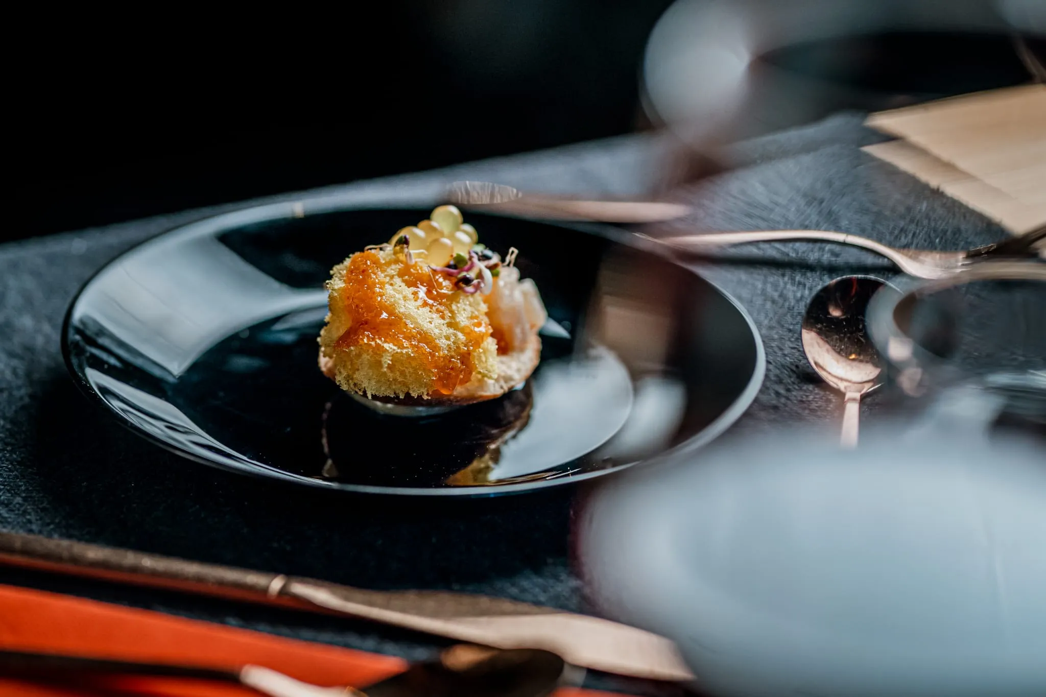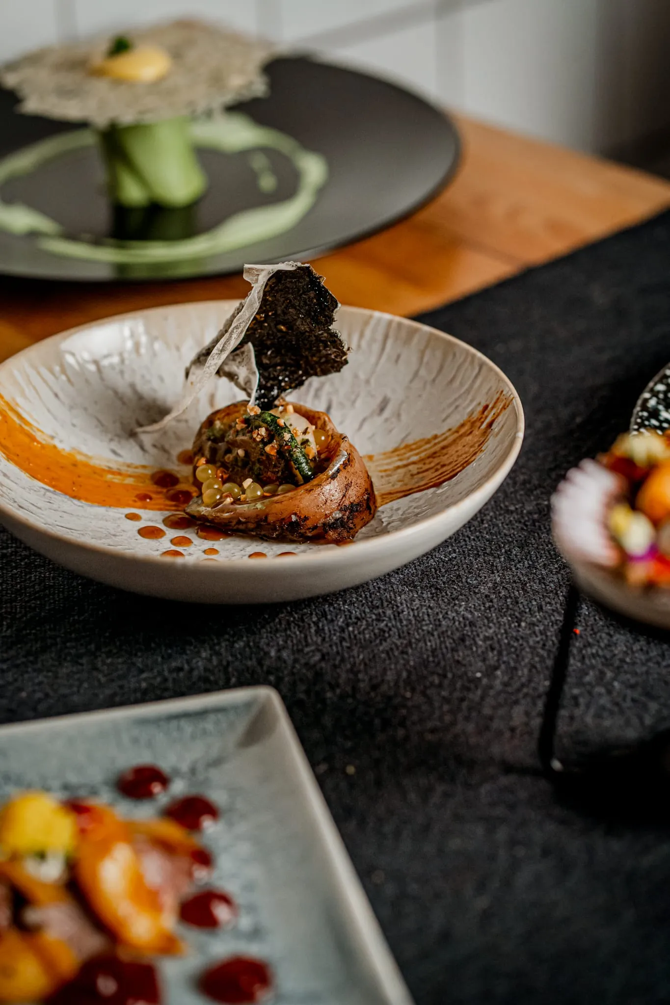 Los menús degustación son la auténtica joya de Calma y Caos. El menú “Océanos de Calma” invita a recorrer sabores marinos con propuestas sorprendentes como gyozas artesanas de gambas sobre ajoblanco extremeño, tiradito de gallo de San Pedro con texturas cítricas o vieiras asadas con mermelada de sobrasada mallorquina. Por otro lado, el menú “Vegan Chaos” deslumbra con creaciones 100% vegetales como el lingote de tofu casero macerado en Tajín con crema de mosto mallorquín o la esfera crujiente de lentejas con salsa de té y jengibre.