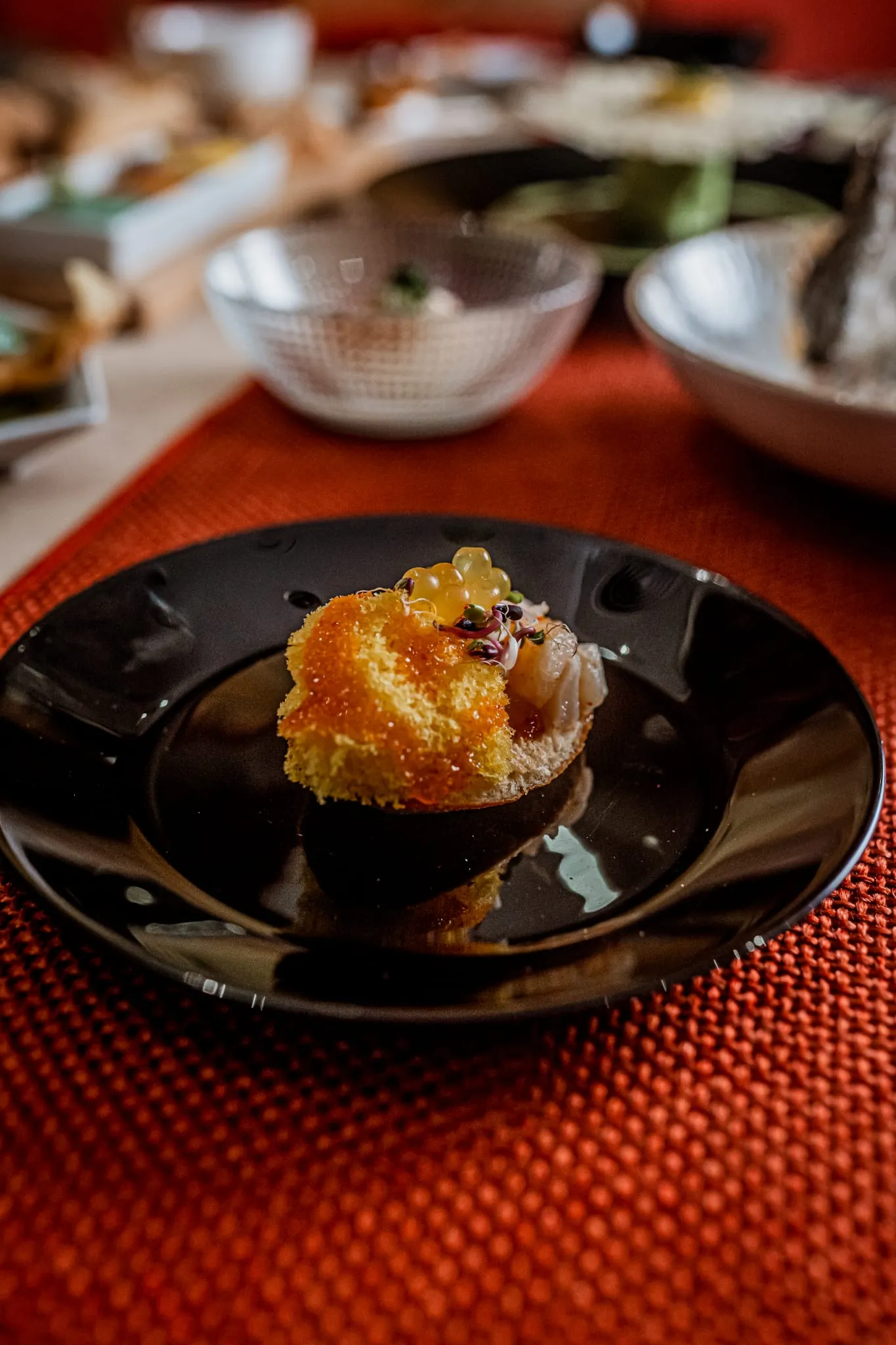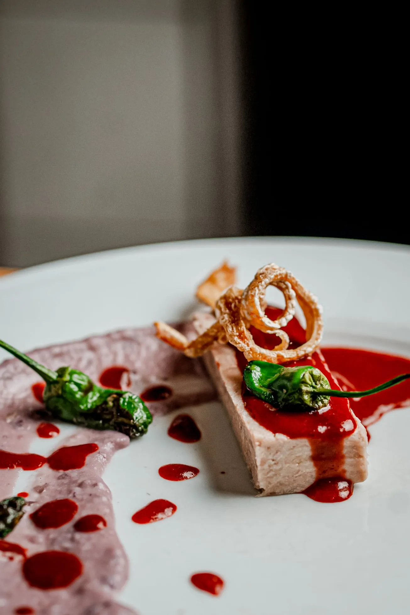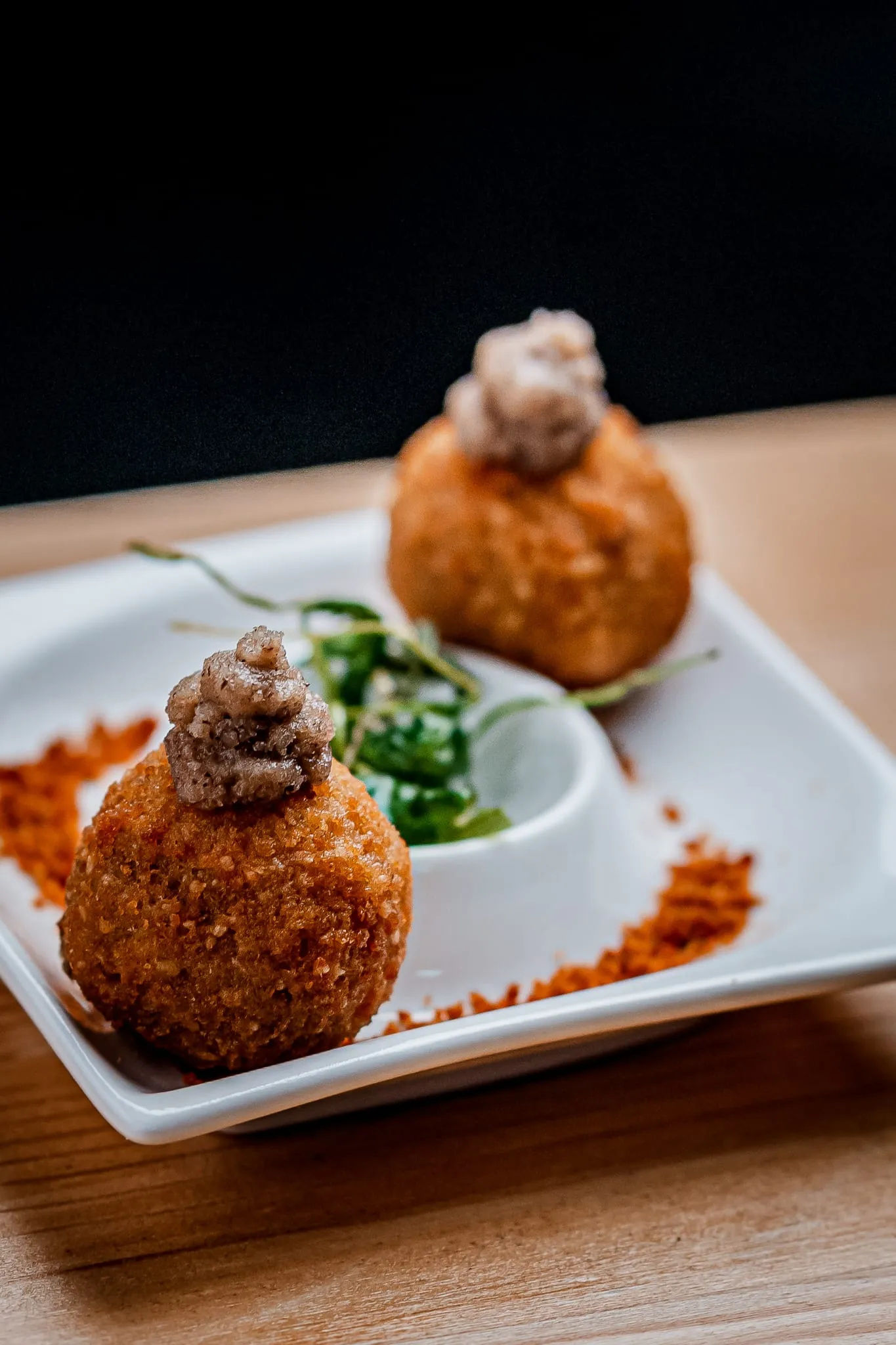 Los menús degustación son la auténtica joya de Calma y Caos. El menú “Océanos de Calma” invita a recorrer sabores marinos con propuestas sorprendentes como gyozas artesanas de gambas sobre ajoblanco extremeño, tiradito de gallo de San Pedro con texturas cítricas o vieiras asadas con mermelada de sobrasada mallorquina. Por otro lado, el menú “Vegan Chaos” deslumbra con creaciones 100% vegetales como el lingote de tofu casero macerado en Tajín con crema de mosto mallorquín o la esfera crujiente de lentejas con salsa de té y jengibre.
