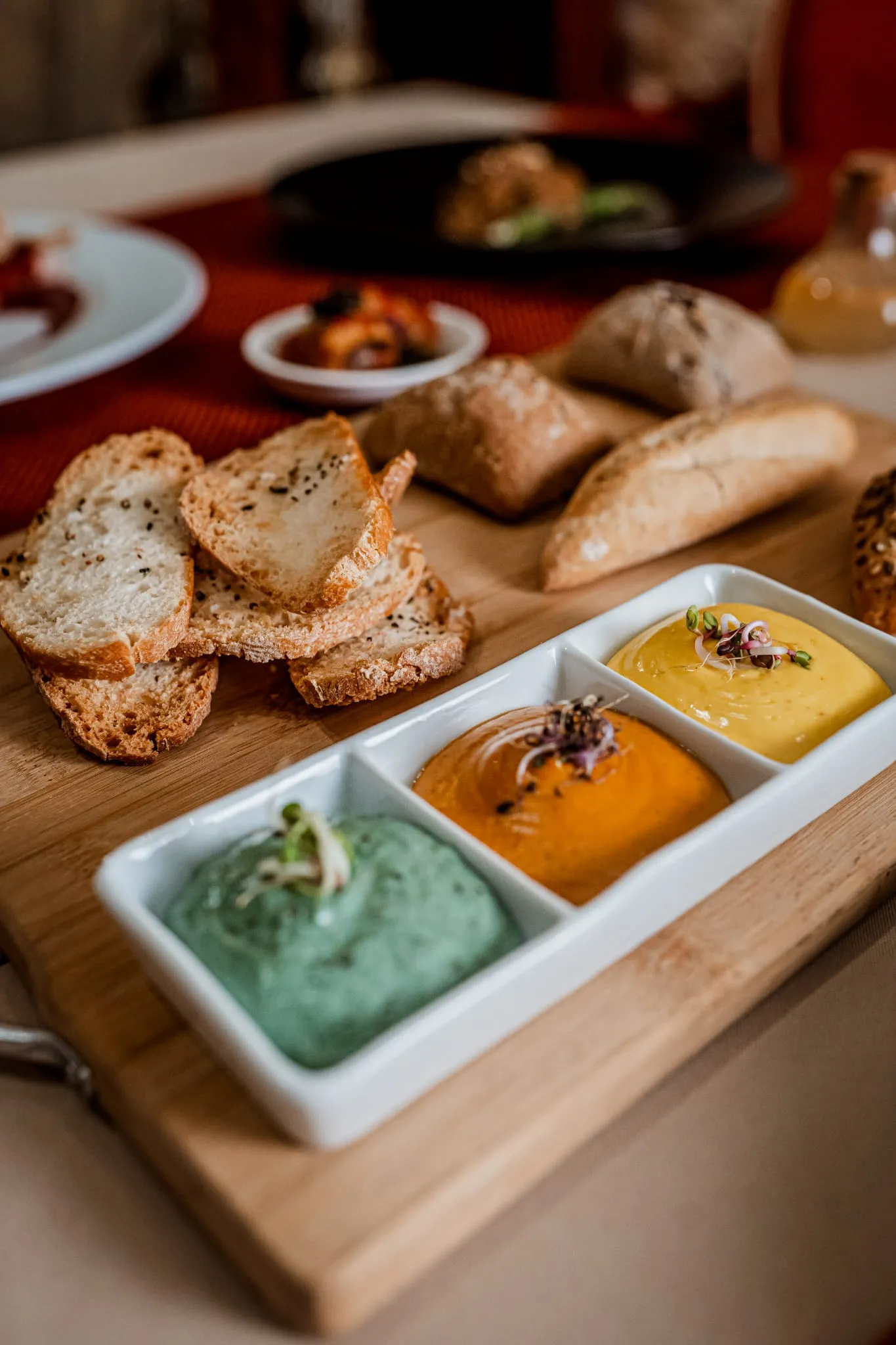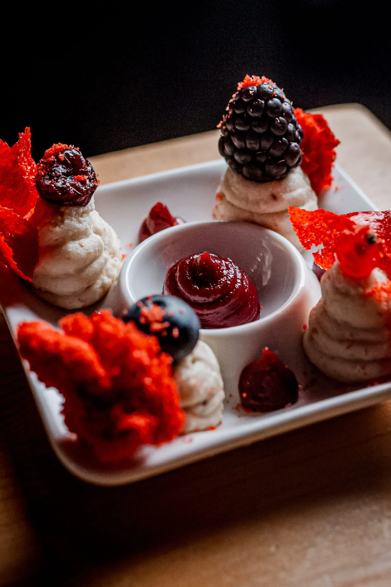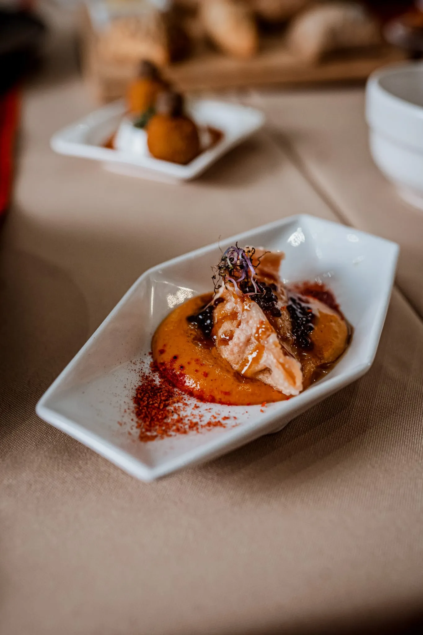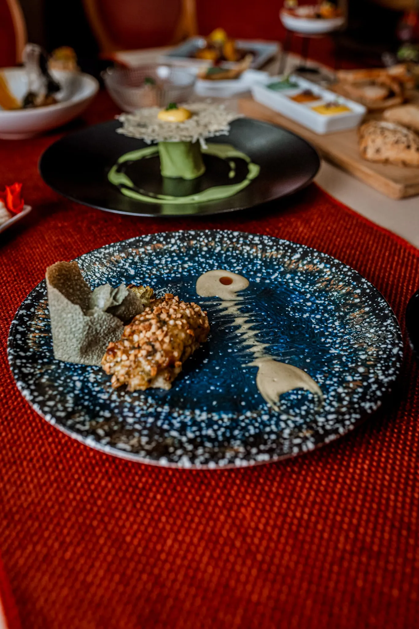 Los menús degustación son la auténtica joya de Calma y Caos. El menú “Océanos de Calma” invita a recorrer sabores marinos con propuestas sorprendentes como gyozas artesanas de gambas sobre ajoblanco extremeño, tiradito de gallo de San Pedro con texturas cítricas o vieiras asadas con mermelada de sobrasada mallorquina. Por otro lado, el menú “Vegan Chaos” deslumbra con creaciones 100% vegetales como el lingote de tofu casero macerado en Tajín con crema de mosto mallorquín o la esfera crujiente de lentejas con salsa de té y jengibre.
