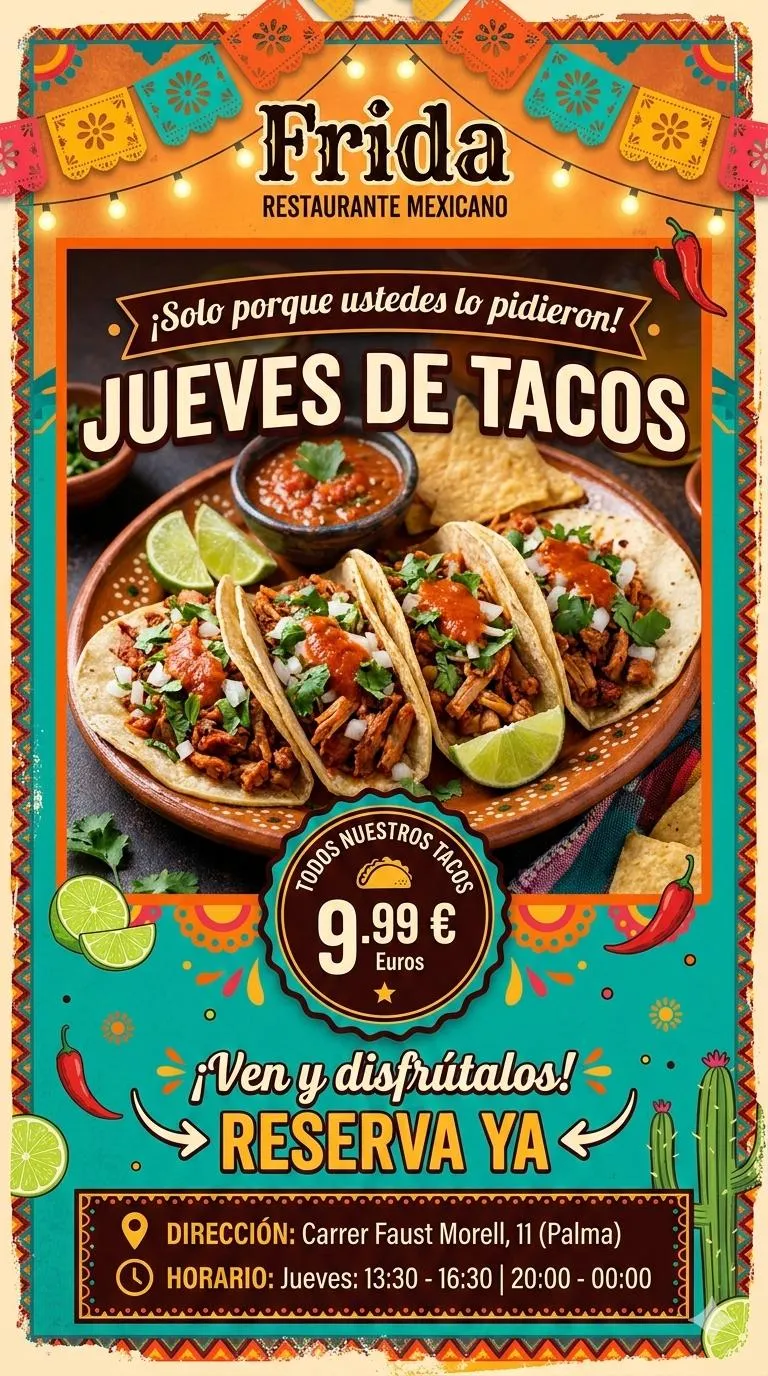 En Frida Restaurante, los jueves se celebran los Jueves de Tacos, todos sus tacos por solo 9,99€. ¡No te lo pierdas y reserva ya tu mesa!