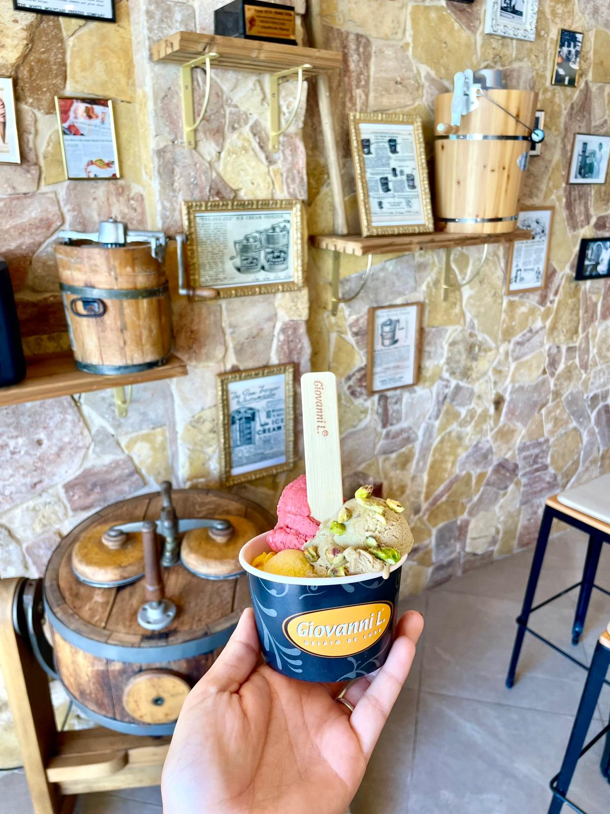 Uno de sus mayores orgullos es su helado de pistacho, galardonado dos veces como el mejor del mundo, elaborado con pistacho verde siciliano de primera calidad y sin aditivos artificiales. Esta joya de la carta representa a la perfección el espíritu de Giovanni L. Gelato de Luxe: pasión, autenticidad y perfección en cada cucharada.