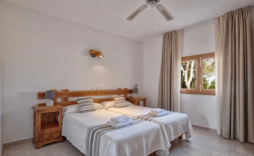 - Apartamento 2 habitaciones Standart: Capacidad para 6 personas, cocina y salón equipados, terraza y jardín compartido, cerca de Es Pujols y playas principales.
