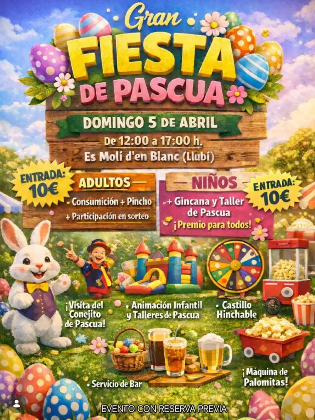 The Great Easter Festival in Es Molí d'en Blanc It is the ideal plan to enjoy an unforgettable day with the family, surrounded by nature and a good atmosphere. This Easter day is designed so that both children and adults can live a complete experience, combining fun, entertainment and unique moments.