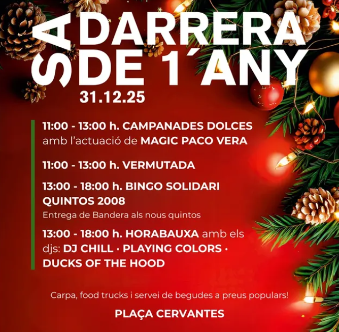 Sa Darrera de s’Any llega a Can Picafort para despedir el 2025 con una gran fiesta familiar llena de música y buen ambiente. La jornada incluye campanadas dulces con espectáculo de magia, vermutada popular, bingo solidario, entrega de bandera a los nuevos quintos y sesiones de DJ durante toda la mañana y tarde. Además, habrá foodtrucks, carpa y bebidas a precios populares. Una celebración pensada para todos los públicos, ideal para dar la bienvenida al nuevo año de forma festiva y participativa en el corazón del municipio.
