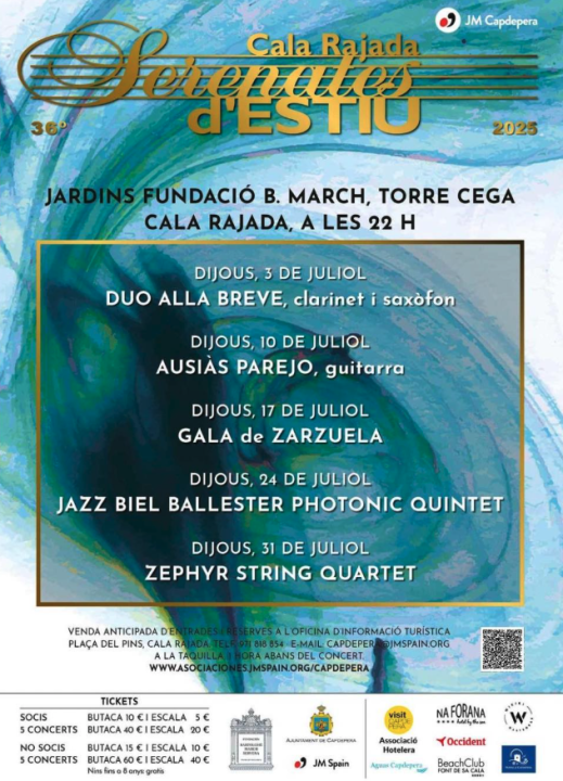 The serenads d’ Estiu return this summer to the emblematic gardens of the Bartomeu March Foundation, Cega Torre, in Cala Rajada. Every Thursday at 10:00 p.m., you can enjoy varied concerts that include jazz, guitar and gala de Zarzuela. The cycle begins on July 3 and ends on July 31 with the Zephyr String Quartet. Tickets are available at the Tourist Information Office of the Plaça Dels Pins or at the box office one hour before the concert. Live the magic of music in one of the most beautiful stages in Mallorca.